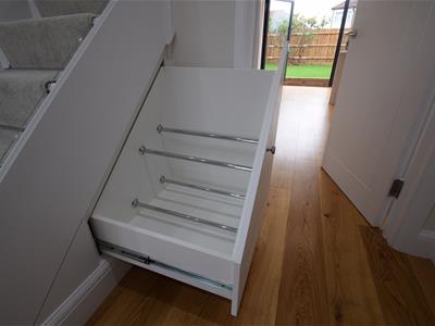 Spacious entrance hall with engineered real wood flooring, neutral decoration, a grey composite double glazed front door, spot lights to ceiling, elegant white painted staircase with neutral carpeted runner and chrome fixings, clever under stairs pull-out show drawer.