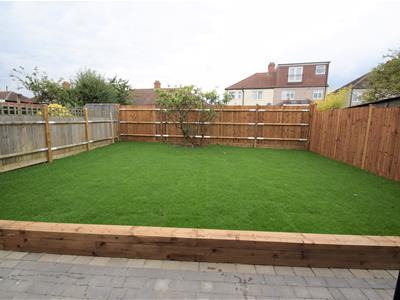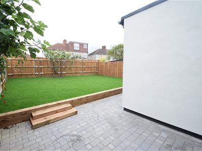 The rear garden is an attractive square shaped area with new fenced boundaries, a paved patio, wood sleeper shallow wall stepping up to the newly laid lawn, and an attractive tree to the centre rear of the garden. There is also a side access gate.