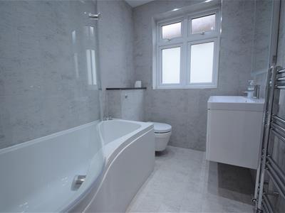2.44m x 1.68m (8'0 x 5'6)Grey floor and wall tiles, "P" shaped bath with shower over and curved glass shower screen, wall integrated shower mixer, wide gloss white vanity unit with two drawers and integrated wash basin, concealed cistern WC, spot lights, under floor heating, extractor fan, UPVc double glazed window.