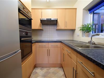 2.06m x 2.06m (6'9 x 6'9)Glazed entry doors to kitchen, neutral colour tile effect cushioned vinyl flooring, neutral emulsion painted walls, wood effect modern kitchen suite with black/grey natural stone effect laminated worktops, 1.5 bowl sink and drainer unit, glass ceramic hob with extractor over, high level built in oven and microwave, UPVC double glazed window, ceiling light fitting.