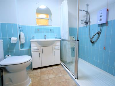 2.31m max recess x 1.68m (7'7 max recess x 5'6)White painted door, neutral tile effect vinyl flooring, modern blue and white wall tile to most wall areas, with the remainder painted in neutral emulsion, large walk-in shower enclosure with electric shower unit, WC, white gloss finish vanity storage unit with top mounted modern wash basin, chrome heated towel rail, ceiling light fitting, extractor fan.