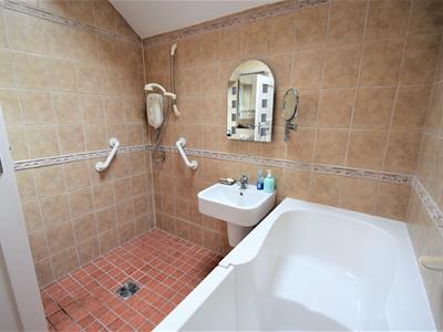 Lobby area with storage cupboard between hallway and panelled door to bathroom, tiled floor, walk-in white bath, wall mounted wash basin, wall fitted shower unit with wet room style shower and floor drainage inset into the floor tiles, concealed cistern WC, fully tiled walls in neutral stone effect tile, UPVC double glazed window and hardwood framed double glazed Velux window to sloping ceiling.