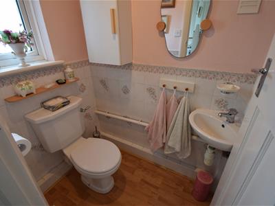 1.55m x 1.09m (5'1 x 3'7)White painted panelled door, wood effect vinyl flooring, part tiled walls, remainder emulsion painted, UPVC double glazed window, ceiling light fitting, WC, small wall mounted corner basin.
