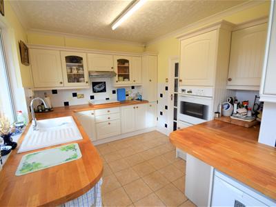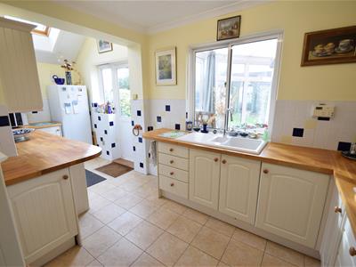 5.54m max x 2.79m max, reducing to 1.78m (18'2 maxGlass panelled door from hallway, neutral colour floor tiling, yellow emulsion painted walls, cream colour substantial fitted kitchen sutie with solid wood Butcher block worktops, electric hob with extraction above, high level oven, double glazed sliding window to conservatory and hardwood framed double glazed Velux window to sloping ceiling, double glazed door to garden, ceiling light fitting.