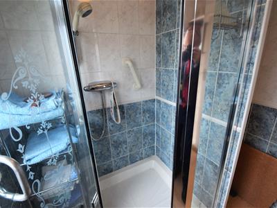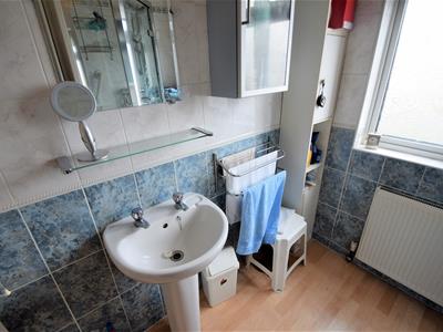 1.98m max x 1.65m max (6'6 max x 5'5 max)White panelled door, wood effect vinyl flooring, two tone white and blue wall tile, pedestal was basin, large corner shower enclosure with wall integrated shower mixer, airing cupboard, UPVC double glazed window, radiator, ceiling light fitting.