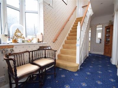 UPVC double glazed front door with ornamental flank double glazed window, fitted door mat, carpeted flooring, wall paper to walls, picture rail, Oriel bay window to side, neutral carpet to stairs, ceiling light fitting, under stairs storage cupboard.