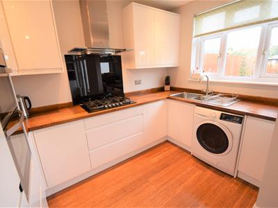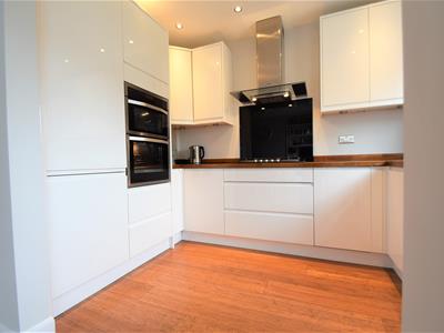 3.20m x 2.08m (10'6 x 6'10 )Wood laminate flooring, modern gloss white kitchen suite with solid wood butcher block style worktops, integrated fridge freezer, integrated dishwasher, space and plumbing for washing machine, modern five ring gas hob with a glass and stainless steel extractor hood, high level double oven, spotlights to ceiling, UPVC double glazed window.