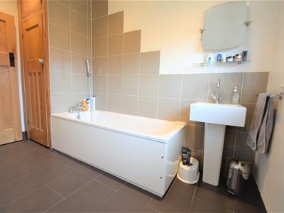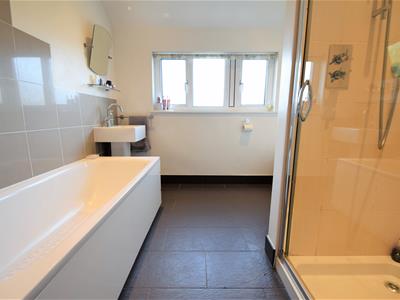 3.23m max x 2.67m max (10'7 max x 8'9 max)Solid Wood panelled door, dark grey ceramic floor tile, part tiled walls with remainder painted in white emulsion, white bath, pedestal wash basin, W/C, shower enclosure with wall inset chrome shower controls and glass entry door, spotlights, extractor fan, chrome heated towel rail, UPVC double glazed window.