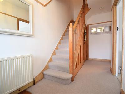 Solid wood painted front door with upper glass panels and flanking windows, fitted door mat, neutral carpet, white emulsion painted walls, picture rail, under stairs cupboard, ceiling light fitting and radiator.