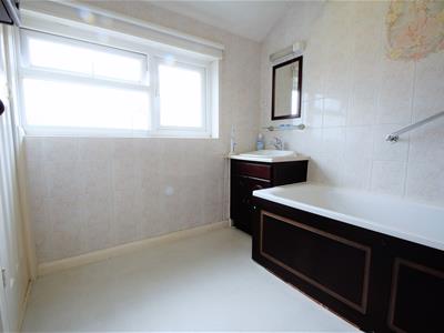 2.34m x 2.11m (7'8 x 6'11)White painted wood panelled door, light colour vinyl flooring, tiled walls, white bath with electric shower over, dark wood vanity unit with integrated wash basin, built in cupboard, radiator, ceiling light fitting, UPVC obscured glass double glazed window.