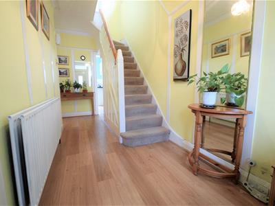 Enclosed UPVC double glazed porch with sliding entry door, lighting, UPVC double glazed front door into hallway, wood laminate flooring, emulsion painted walls with white wood panelling, double radiator, wall mirror, coving, ceiling light fitting, under stairs cupboard.
