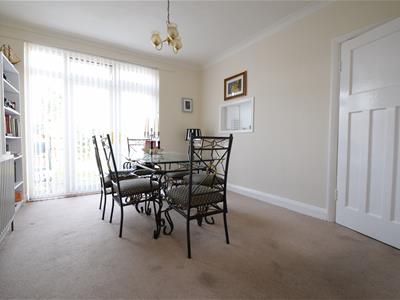 3.66m x 3.35m max into recess (12'0 x 11'0 max intNeutral colour carpet, white painted wood panelled door, neutral emulsion painted walls, double radiator, UPVC double glazed french doors opening to garden, coving, serving hatch to kitchen, ceiling light fitting.