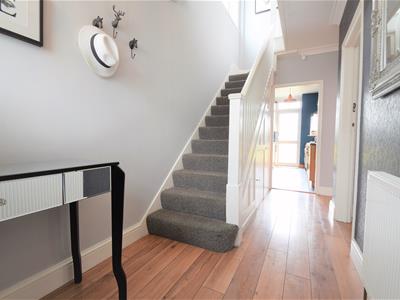 Enclosed front porch with double glazed entry doors, tiled floor, ceiling light fitting, white painted internal walls, solid wood front door, grey emulsion painted walls with feature wall papered wall, coving, radiator, under stairs storage cupboard, grey carpet to stairs, alarm control panel.
