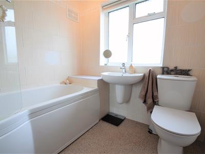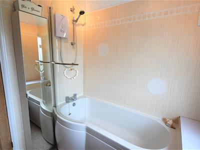 2.06m x 2.03m (6'9 x 6'8)Solid wood panelled door, neutral colour stone effect vinyl flooring, white P shaped bath with shower over and curved glass shower screen, half pedestal wash basin, WC, chrome heated towel rail, fully tiled walls in a modern cream colour ceramic tile, ceiling light fitting, double glazed window.