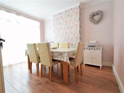 3.68m x 3.02m max (12'1 x 9'11 max)Solid wood panelled door, wood effect laminated flooring, pastel emulsion painted walls with wall papered feature chimney breast, radiator enclosed in a decorative wooden cover, coving, ceiling light fitting, double glazed sliding patio doors to garden.
