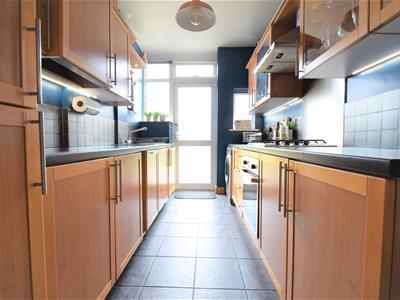 3.51m x 2.11m (11'6 x 6'11)Grey tiled flooring, wood finish kitchen suite with dark grey counter tops, silver splash back tiling, blue emulsion painted upper walls, gas hob, electric oven, stainless steel extractor hood, stainless steel 1.5 bowl sink and drainer unit, double glazed window and door to garden, integrated appliances including fridge freezer, washing machine and dish washer.
