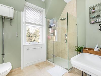 2.21m narrowing to 2.01m x 2.87m narrowing to 2.51Solid painted panelled door with glazed panels over, white wooden double glazed sash window to front, enclosed shower cubicle with fixed 'Rainfall' shower head and chrome control panel, Travertine tiled wall in shower area, Savoy white pedestal wash hand basin with chrome cross-head mixer taps, sage green emulsioned walls, w.c. with high level cistern, recessed down-lights, Travertine tiled floor, underfloor heating control.