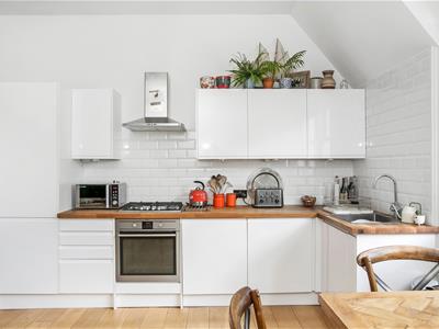 4.95m x 4.95m (16'3 x 16'3)Solid wood panelled door, wooden double glazed sash windows to front, cast iron fireplace with ornate painted wood surround and slate hearth, high skirting, range of contemporary white wall and base units, AEG electric oven with AEG 4 ring gas hob and AEG extractor hood above, AEG integrated fridge and freezer, AEG 'Favorit Pro Intensiv' dishwasher, white 'Metropolitan' tiled splash-back, wooden 'butcher block' style worktops, stainless steel sink with chrome mixer tap, under cabinet lighting, wooden flooring, telephone point, ceiling light fitting,
