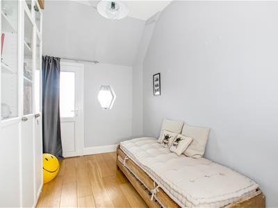 3.63m x 2.24m (11'11 x 7'4)Solid wood painted panelled door with glazed panels above, diamond picture window, uPVC part double glazed door giving access to steps leading down to shared roof terrace, pale blue emulsioned walls, wooden flooring, ceiling light fitting.