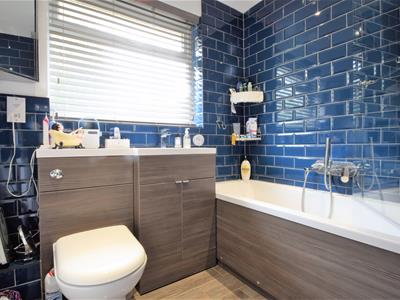 2.03m x 1.70m max (6'8 x 5'7 max)White painted panelled door, high gloss grey colour wood grain effect ceramic floor tile, part painted walls with blue colour brick work style tiles to remainder, white bath with shower over and a glass shower screen, wall integrated shower controls and outlet, and side of bath mounted mixer tap, wood effect vanity storage unit with top mounted wash basin and concealed cistern WC, double glazed window, spot lights, extractor fan, chrome heated towel rail.