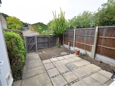 To the rear is a courtyard style garden with paved patio, planting area, and external storage cupboard and a rear gate providing additional access to the garden.