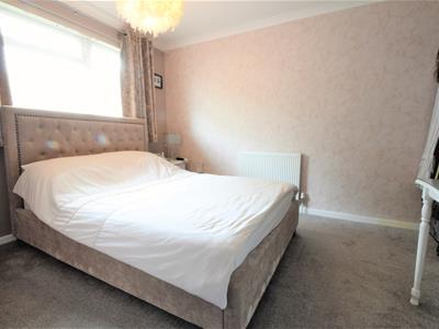 3.84m x 2.74m (12'7 x 9'0)White painted panelled door, grey carpet, neutral emulsion painted walls with feature wall papered wall, recess with fitted hanging and shelving, double glazed window, ceiling light fitting, coving, radiator.