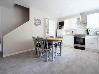 4.88m x 3.23m (16'0 x 10'7)Glazed door from hallway, grey tile effect flooring, grey emulsion painted walls, white gloss kitchen suite with white laminated quarts effect worktops, under stairs storage cupboard, double glazed window, radiator, ceiling light fitting, spot lights.