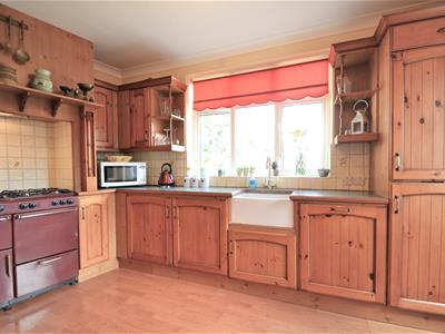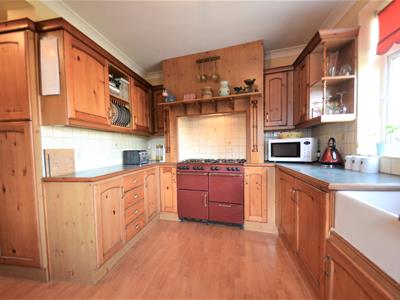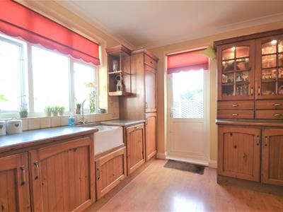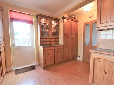 3.78m narrowing to 2.72m x 4.24m max (12'5" narrowSolid wooden door with decorative opaque glazed panels, uPVC double glazed window to rear, uPVC half glazed door to side, range of wood 'Shaker' style wall, base and display units with recessed downlights. Green stone effect laminate worktops, white 'Butler' sink with brass mixer taps, space for 8 ring gas range cooker with faux chimney breast feature and bespoke mantle incorporating Hotpoint extractor fan. Integrated dishwasher, Integrated fridge and freezer, tiled splashbacks, coving, laminate wood flooring, ceiling light fitting,