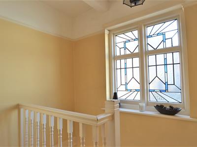 Leaded, decorative stained glass window to side, picture rail, hatch to loft, ceiling light fitting, fitted carpet.