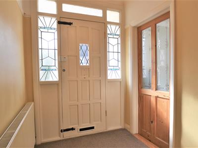 Solid wood panelled front door with leaded glazed vision light and leaded stained glass sidelights. Understairs coats cupboard with light fitting housing fuseboard, gas and electric meters. Radiator, wood flooring, coving, ceiling light fitting. Stairs to first floor.
