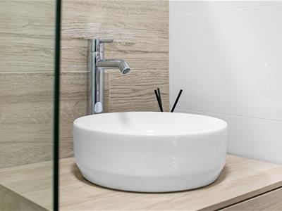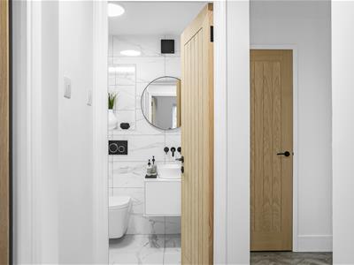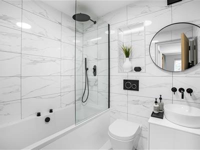 2.01m x 1.55m (6'7 x 5'1)Wood finish door, ceramic marble effect floor, and wall tiles, gloss white wall hung vanity unit with countertop washbasin, WC with concealed cistern, white bath with side fill taps, wall integrated shower controls and a fixed overhead shower head, illuminated niche, ceiling light fitting, heated towel rail.