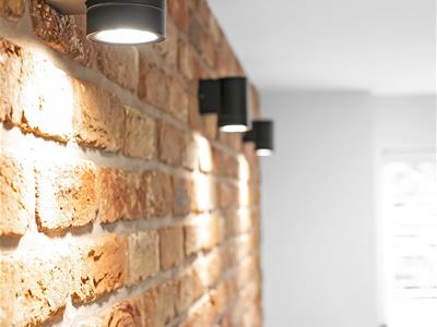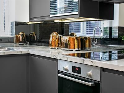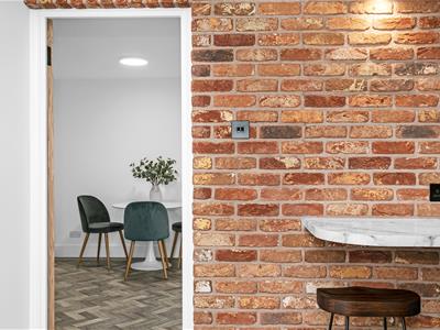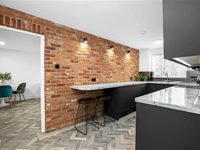 Ultra-modern kitchen suite with integrated appliances including high level integrated microwave, natural stone effect countertops, attractive slip-brick style exposed brick wall with modern wall lights, extended breakfast bar counter, mirrored splashback, double glazed window, ceiling light fitting, grey Karndean herringbone laminate flooring with custom border.