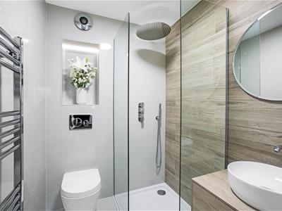 2.26m max to door x 1.52m (7'5 max to door x 5'0)Wood finish door, cream floor and wall tile with feature wood grain effect tiled wall, wood finish wall hung vanity unit with counter top wash basin, corner walk-in shower with glass walls and chrome wall integrated shower controls, wall mounted WC, illuminated recess, chrome heated towel rail, ceiling light fitting.