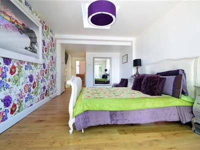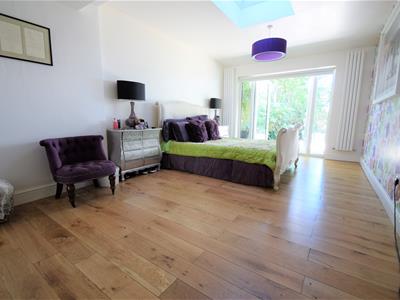 7.52m max door recess x 3.30m max (24'8" max doorWood flooring, white emulsion painted walls with one feature wall, two built in wardrobes with painted wood doors, double glazed French doors leading out to private rear garden, skylight to centre of ceiling, radiator, ceiling light fitting.