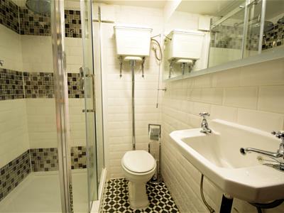 Period floor tiles, wall mounted white wash basin, High level flush WC, large glass shower enclosure with wall integrated shower controls, chrome over head fixed shower head, wall jets, separate hand held shower hose with wall mounted height adjustable fixing, ceiling light fitting, white tiled walls with silver/mirrored mosaic design to shower walls, small chrome heated towel rail, extractor,