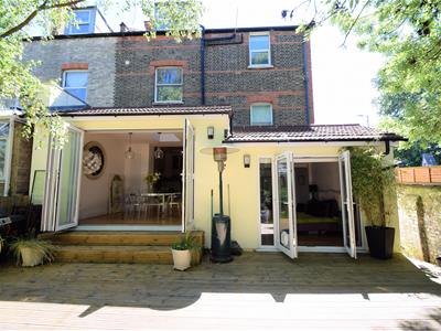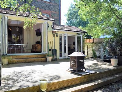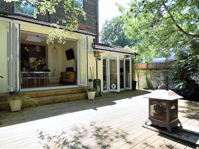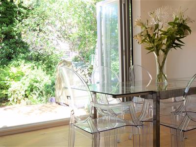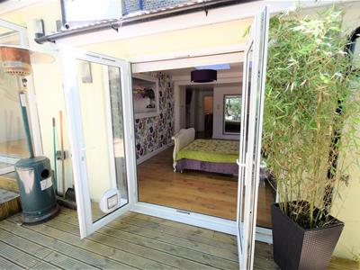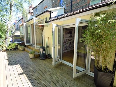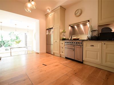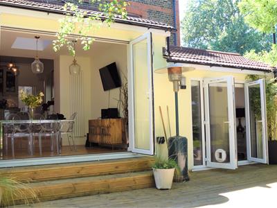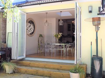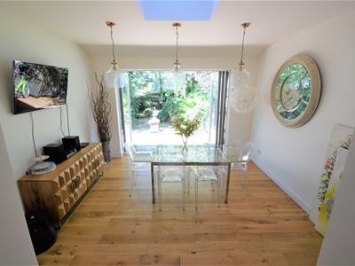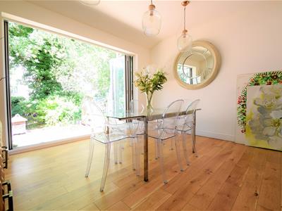 4.01m x 3.51m (13'2 x 11'6)Open plan to kitchen/diner and separate by steps, solid wood flooring,white emulsion painted walls, skylight, bi-folding doors leading out to private rear garden, three low level ceiling light fittings, two modern upright tall radiators.