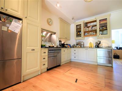 4.60m x 3.81m max recesses (15'1 x 12'6 max recessSolid wood flooring, neutral colour solid wood kitchen suite with wall and base cabinets, solid stone counter tops, space for cooking range into recess, stainless steel splash panels and stainless steel extractor unit, under counter mounted twin double stainless steel basin with modern mixer tap, built in dishwasher, space for oversized fridge/freezer, ceiling light fitting and wall lights, coving, steps down to: