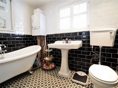 2.57m x 2.06m (8'5 x 6'9)Period style floor tiles, Victorian roll-top bath with chrome claw feet, large period style pedestal wash basin, high flush WC, two tone black and white wall tiles in brickwork design, UPVC double glazed window, spot lights, combination gas boiler, built in full length wall mirror, radiator and combined towel rail.
