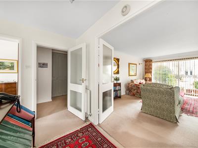 Wooden front door, built-in coats cupboard, ceiling light fitting, Artex ceiling, fitted carpet, GWPP glazed door to:-