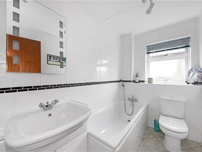 uPVC frosted double glazed window to rear, modern white suite comprising vanity unit with basin and chrome mixer tap and wall mounted mirror, low-level w.c., panelled bath with handheld shower spray attachment, fully tiled walls, tiled floor, Artex ceiling, ceiling light fitting.