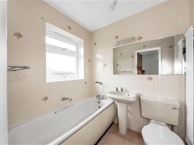 uPVC frosted double glazed window to rear, cream suite comprising pedestal wash hand basin with chrome taps, wall mounted light with shaver point, panelled bath with mixer tap and handheld spray attachment, low-level w.c., fitted chrome towel rails, tiled walls, radiator, walk-in fully tiled shower cubicle with Mira shower, Artex ceiling, ceiling light fitting, fitted carpet.