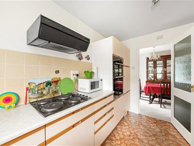 uPVC double glazed window to front, range of cream wall and base units with laminate worktops incorporating a breakfast bar (gas meter in the corner underneath), stainless steel double sink with chrome mixer tap and drainer, Siemens double oven, Neff 4-ring electric hob with Neff extractor hood over, space and plumbing for washing machine, space for fridge freezer, cupboard housing Worcester boiler, tiled splashbacks, radiator, Artex ceiling, ceiling light fitting, linoleum flooring.