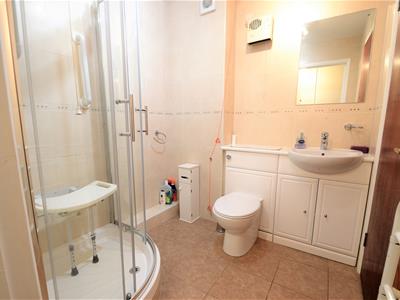 uPVC double glazed window to rear, electric storage heater, emergency alarm pull cord, two ceiling light fittings, fitted carpet. Opening to:-