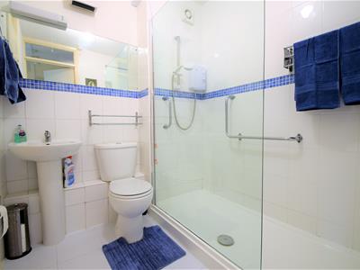 1.91m max x 1.85m (6'3 max x 6'1)White painted door, white tile effect vinyl flooring, large walk-in shower with tall glass screen, electric shower unit, pedestal wash basin, WC, part tiled walls, fitted mirror, large airing cupboard, wall heater, extractor fan, ceiling light fitting.