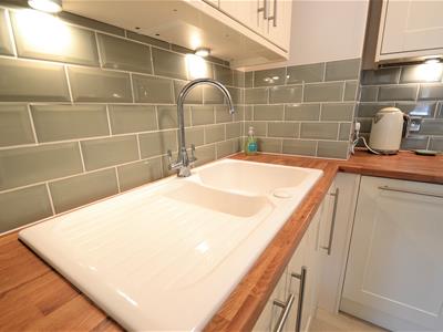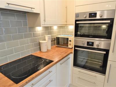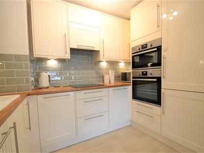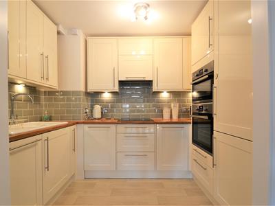 High gloss cream wall and base units with 'butcher block' style wood effect laminated worktops incorporating white ceramic one and a half bowl sink and drainer with chrome mixer tap, Zanussi electric induction hob with extractor hood over, Zanussi double oven, integrated fridge/freezer, integrated Zanussi dishwasher, sage green 'Metropolitan' tiled splashbacks, ceiling light fitting, extractor fan, limed oak style linoleum flooring, opening to living room.