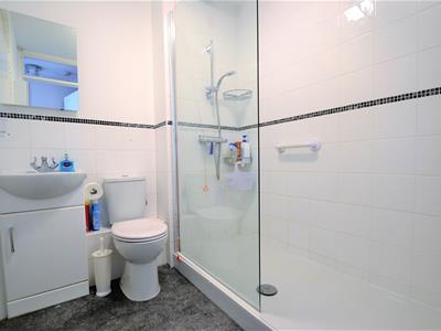 White suite comprising wash hand basin with vanity unit, low-level w.c. large walk-in shower with glass screen and wall mounted shower, chrome heated towel rail, large airing cupboard housing hot water cylinder, tiled walls with mosaic border, ceiling light fitting, wall mounted fan heater, extractor fan, grey stone effect vinyl flooring.