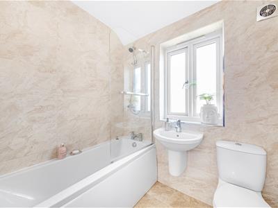 Wooden panelled door, uPVC double glazed frosted window to rear, pale grey suite comprising wall mounted wash hand basin, low-level W.C., panelled bath with chrome mixer shower, marble effect fully tiled walls and floor, chrome towel radiator, extractor fan, ceiling light fitting.
