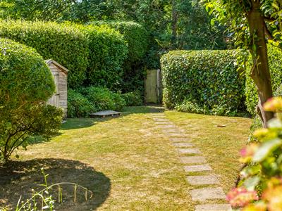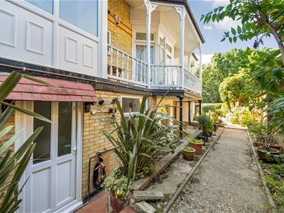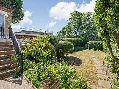 Terracotta tiled steps down to the front door, flanked with raised flower beds, and outside wall light. Cupboard housing gas meters. Steps up to the security gate. Attractive, secluded, south-facing communal gardens.