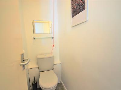 Solid wood painted door, white low-level WC, emergency pull-cord, extractor fan, ceiling light fitting, Artex ceiling, stone effect linoleum flooring.