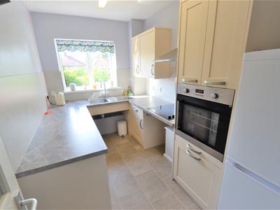 Wooden door with GWPP glazed panels, uPVC double glazed window overlooking rear gardens, range of cream 'Shaker' style wall and base units, stainless steel sink and drainer with chrome mixer tap, Lamona electric hob, extractor hood with light, Lamona electric oven, space for fridge/freezer, marble effect laminate worktops, stone effect laminate splashbacks, wall mounted Dimplex electric heater, emergency pull cord, fluorescent strip light, Artex ceiling, stone effect vinyl flooring.